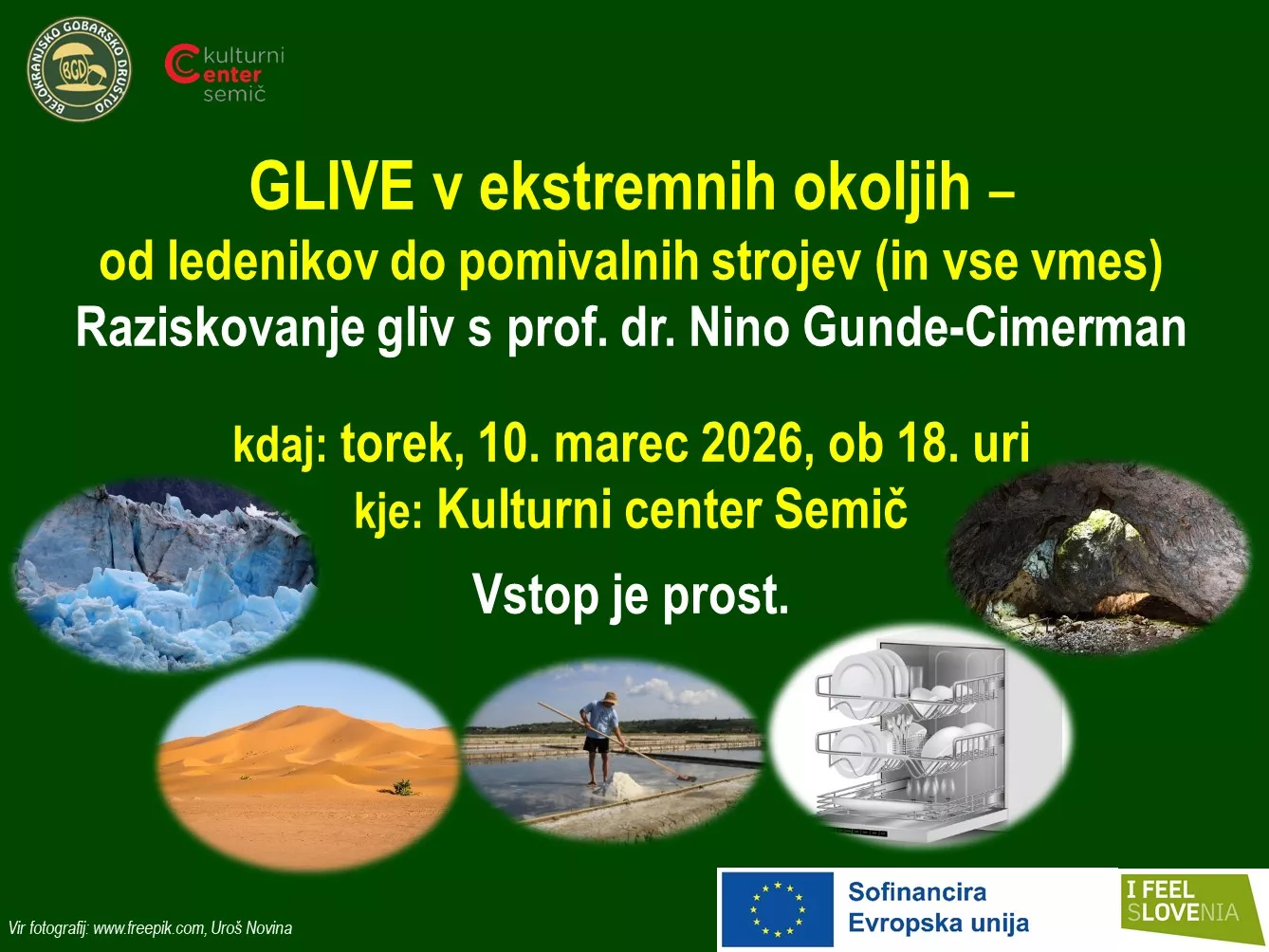 Pridružite se nam na zanimivem predavanju GLIVE v ekstremnih okoljih – od ledenikov do pomivalnih strojev (in vse vmes), ki bo v torek, 10. marca 2026, ob 18. uri v Kulturnem centru Semič, Prosvetna ulica 4, 8333 Semič.